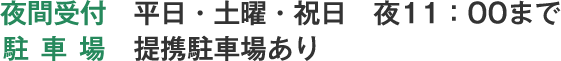 平日、土曜、祝日や祭日は夜間営業をしております。 お仕事帰りでも安心の営業時間です。